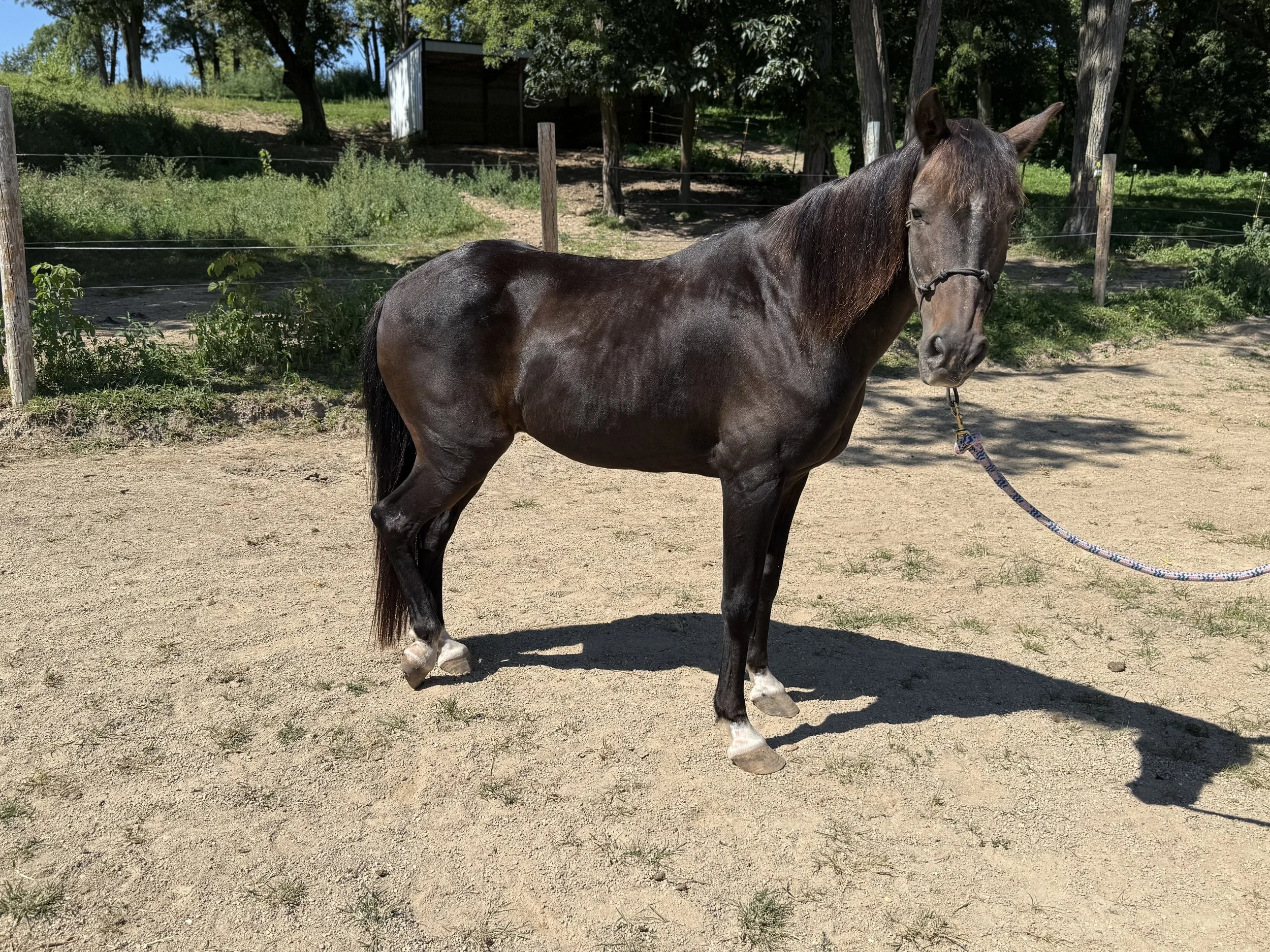 Lu came to us on August 27, 2025 as an owner surrender from Wisconsin, in the Grafton Area. He was surrendered due to his owner’s life circumstances changing. Lu is about 18 years old, and 14h tall. He is the biggest sweet heart that loves attention, but needs a little work in the confidence department. His previous job was a hunter jumper, and man is he a cute little mover! He loves the littles, and is looking for his next job! Lu does well with an advanced beginner, but did well will a beginner during evaluations.