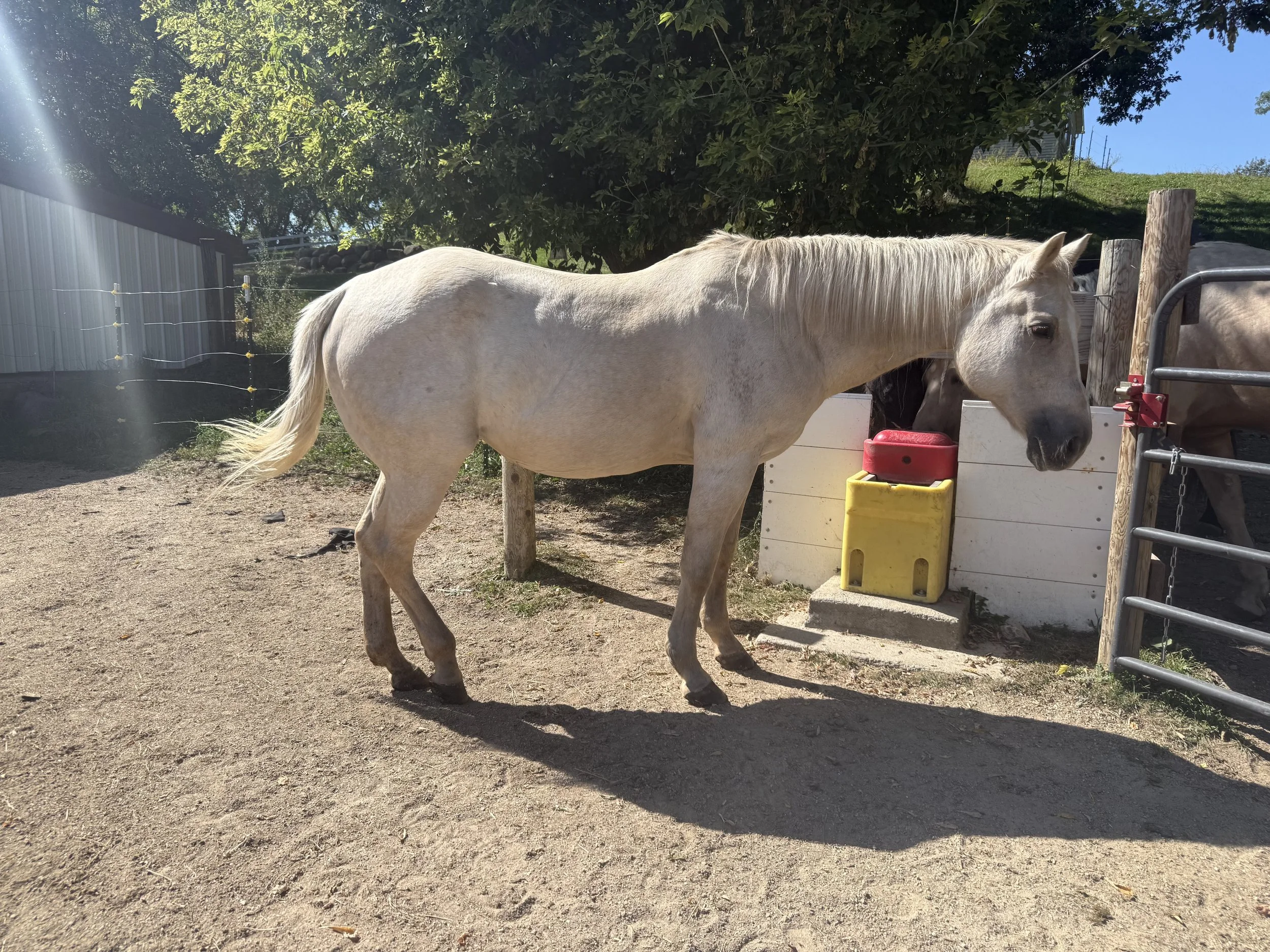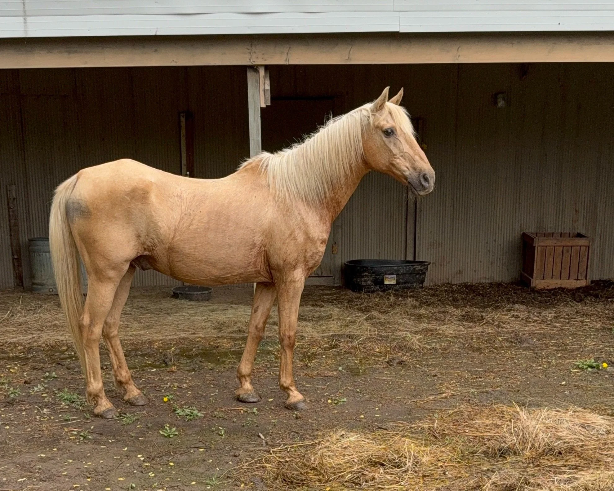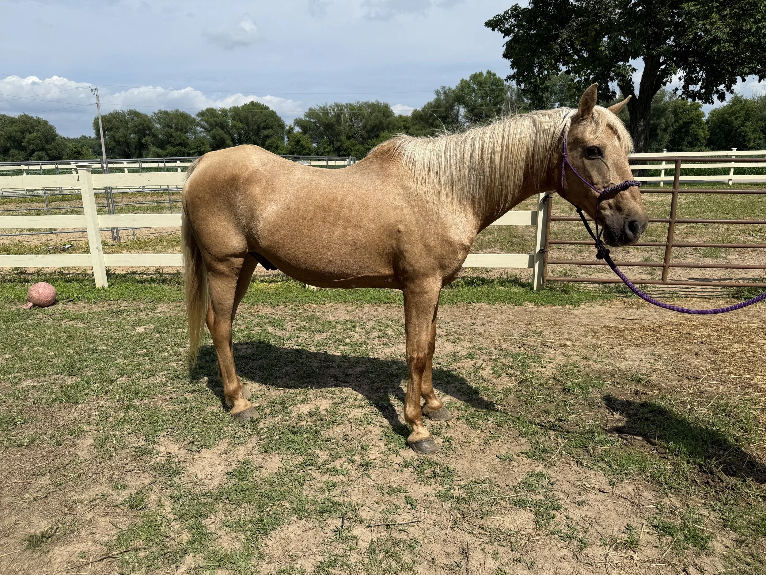 Rooster came to us on June 25, 2025 as an owner surrender from Dane County. He was surrendered due to his owners health. Rooster is approximately 30 years old and stands about 15.2H. He does not act his age, he moves absolutely fantastic, and enjoys running everywhere he goes with the cutest lope. Although Rooster is broke to ride, with his age, he deserves to be retired - but the occasional relaxing ride around wouldn’t hurt. He is not on any maintenance medications, and doesn’t currently have any health concerns that we are aware of. He is up to date on his vaccinations, and just had his teeth floated. Speaking of teeth- his are in pretty good shape for his age, but will benefit to have some mash included in his diet. He is currently doing well on pasture. He loads into the trailer like a dream. Rooster can be difficult to catch, but once he is caught he is a good boy. He can be nervous around the vet and new people, but he tries SO hard to be a good boy. We will work on building his confidence while he is here!