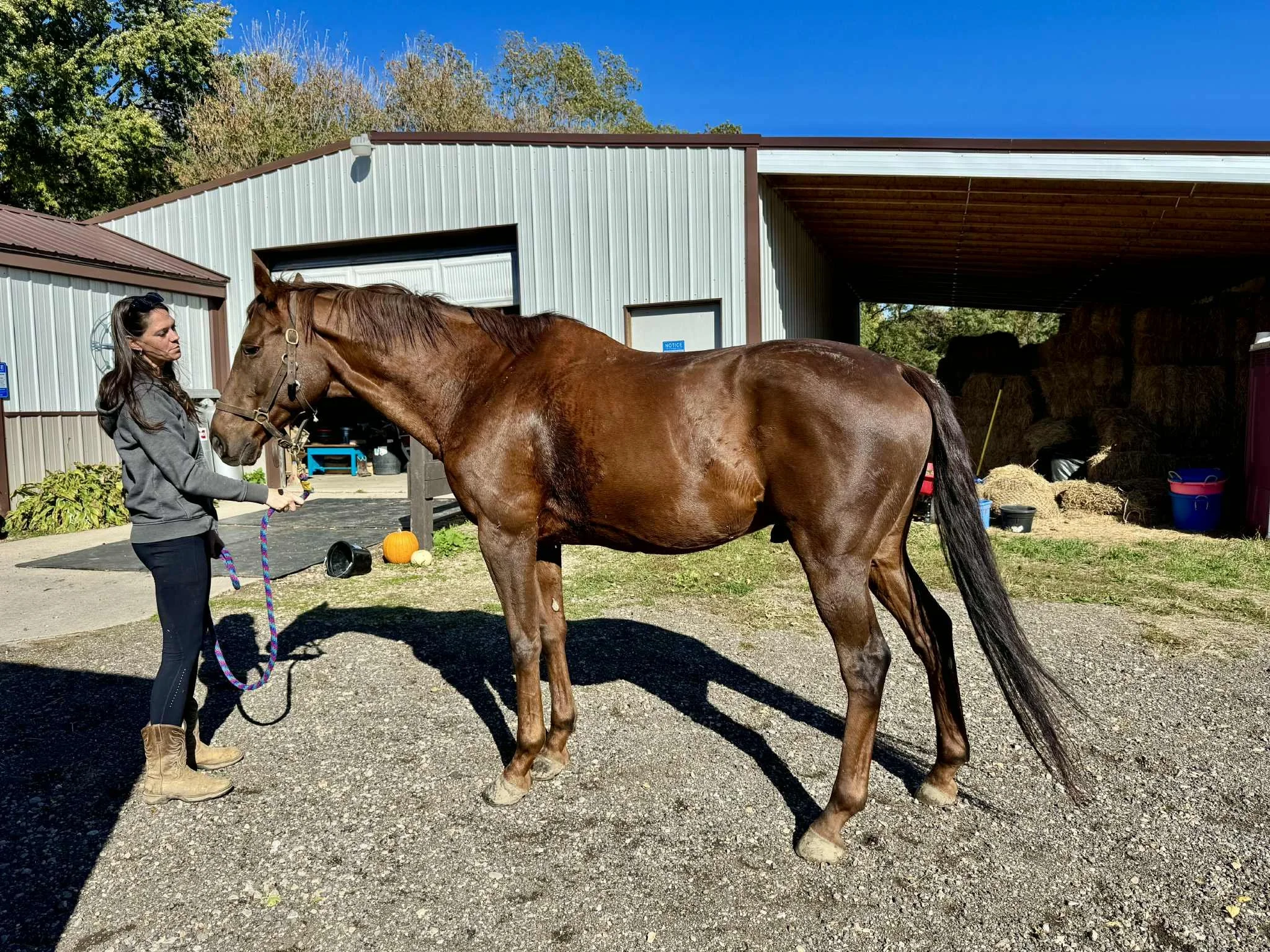 Kody came to us on October 20, 2025 as an owner surrender from Wisconsin, in the Watertown area, originally Minnesota. He was surrendered due to a change in life circumstances. Kody is an OTTB and is 14 years old, and 16.2h tall. He has a lip tattoo, but previous owner was unable to figure out “who he was” even with the help of the Jockey Club. He hasn’t been with many horses as he was pastured with one pasture mate for a while, and then on his own, but seems to be middle of the herd here. He will paw or crib when he is nervous, he has only shown us the pawing. His current job was hunter jumper, and was jumping 2’9” to 3’3” in Minnesota local shows and some rated shows. He seemed to really enjoy jumpers courses according to his previous owner. It is apparent to us already that he is a silly boy. He was so deeply loved by his previous family, and we are honored to be able to get to know him to find him his forever home.